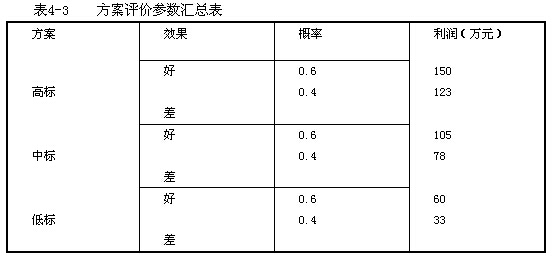五是期望利潤與實際報價中利潤的區(qū)別。期望利潤是綜合考慮各投標(biāo)方案中標(biāo)概率和不中標(biāo)概率所可能實現(xiàn)的利潤,其數(shù)值大小是決策的依據(jù),但其并不是決策方案實際報價中的利潤。因此,決策方案報價應(yīng)以估算成本加上相應(yīng)投標(biāo)方案的計算利潤,而不是估算成本加期望利潤。