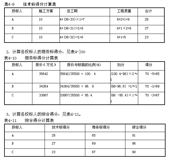 1.技術標共30分,其中施工方案10分(因已確定施工方案,各投標人均得10分)、施工總工期10分、工程質量10分。滿足招標人總工期要求(36個月)者得4分,每提前1個月加1分,不滿足者為廢標;招標人希望該工程今后能被評為省優工程,自報工程質量合格者得4分,承諾將該工程建成省優工程者得6分(若該工程未被評為省優工程將扣罰合同價的2%,該款項在竣工結算時暫不支付給施工單位),近三年內獲魯班工程獎每項加2分,獲省優工程獎每項加1分。