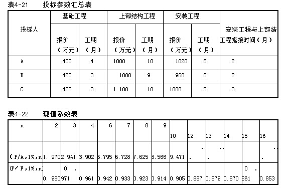 A、B、C三家投標人投標書中與報價和工期有關的數據匯總于表4-21。