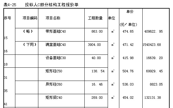 3.投標人C對部分結構工程的報價,見表4-25,請指出其中的不當之處,并說明應如何處理?