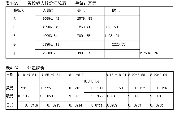 各投標人的報價組成見表4-23,中國銀行公布的2005年7月1 8日至9月4日的外匯牌價見表4-24,投標人C對部分結構工程的報價見表4-25 。