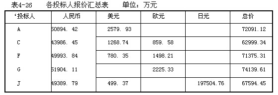 由以上計算結果可知,投標人C報價中外匯所占的比例超過30%,不符合招標文件的規定,而其余投標人報價中外匯所占的比例均符合招標文件的規定。