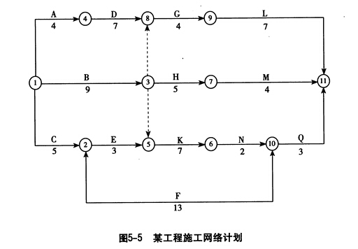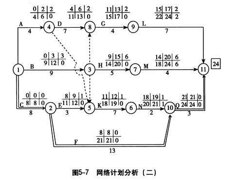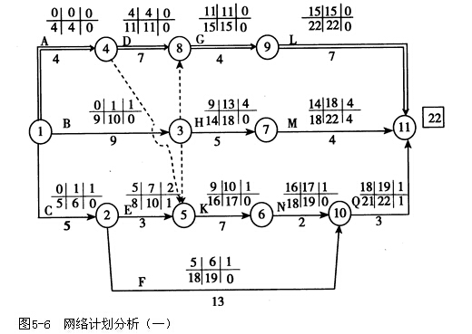 答:通過對該工程的網絡進度計劃進行時間參數計算,關鍵線路為圖5-6中雙箭線所示。