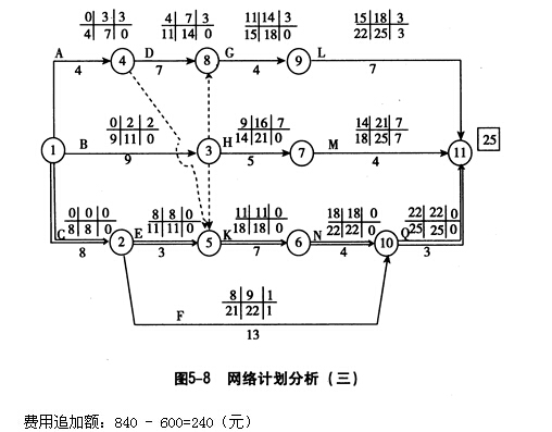 通過計算得知:關鍵線路變為圖5-8中雙箭線所示,關鍵工作為C、E、K、N、Q,工期為25天,使工期拖長25-24=1(天)。應罰款天數為1天。