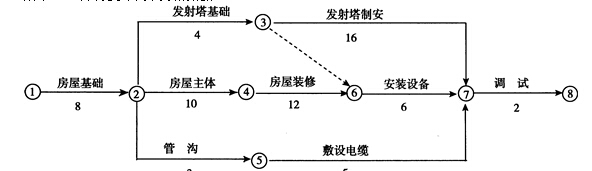 某施工單位(乙方)與某建設單位(甲方)簽訂了建造無線電發射試驗基地施工合同。合同工期為38天。由于該項目急于投入使用,在合同中規定,工期每提前(或拖后)1天獎勵(或罰款)5000元(含稅費)o乙方按時提交了施工方案和施工網絡進度計劃(如圖5-9所示),并得到甲方代表的批準。