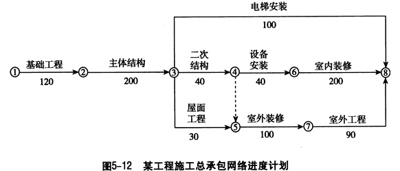 某施工單位(乙方)與建設單位(甲方)簽訂了某工程施工總承包合同,合同約定:工期600天,工期每提前(或拖后)1天獎勵(或罰款)1萬元(含稅費)。經甲方同意乙方將電梯和設備安裝工程分包給具有相應資質的專業承包單位(丙方)。分包合同約定:分包工程施工進度必須服從施工總承包進度計劃的安排,施工進度獎罰約定與總承包合同的工期獎罰相同。乙方按時提交了施工網絡計劃,如圖5-12所示(時間單位:天),并得到了批準。