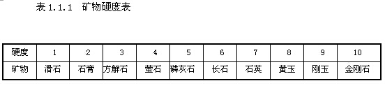 ③硬度。硬度是礦物抵抗外力刻劃、壓人或研磨等機(jī)械作用的能力。鑒定礦物常用一些礦物互相刻劃來測定其相對硬度,一般分為10個(gè)標(biāo)準(zhǔn)等級,如表1.1.1礦物硬度表所列。