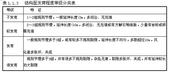 結(jié)構(gòu)面是切割巖體的各種地質(zhì)界面的統(tǒng)稱,是一些具有一定方向,延展較廣較薄的二維地質(zhì)界面,如層面、沉積間斷面、節(jié)理、裂隙、裂縫、斷層等,也包括厚度較薄的軟弱夾層。結(jié)構(gòu)面的特征是影響結(jié)構(gòu)面強(qiáng)度及其他性能的重要因素,一般從方位、間距、延續(xù)性、粗糙度、結(jié)構(gòu)面?zhèn)缺趶?qiáng)度、張開度、充填物、滲流、節(jié)理組數(shù)、塊體大小等方面來描述結(jié)構(gòu)面的特征。其中節(jié)理組數(shù)的多少?zèng)Q定了巖石的塊體大小及巖體的結(jié)構(gòu)類型,表1.1.3是根據(jù)節(jié)理組數(shù)劃分的結(jié)構(gòu)面發(fā)育程度來予以分級的。