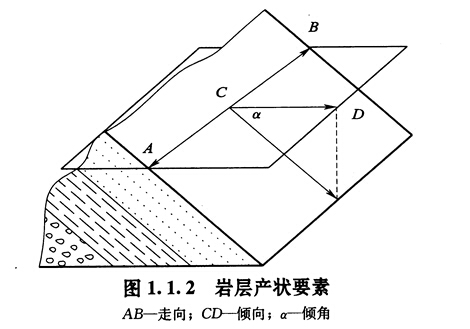 一般將巖層在空間中的位置定義為巖層產(chǎn)狀。傾斜巖層的產(chǎn)狀,是用巖層層面的走 向、傾向和傾角三個(gè)產(chǎn)狀要素,如圖1.1.2所示。一般而言,通過巖層產(chǎn)狀的三個(gè)要素, 可以表達(dá)出經(jīng)過構(gòu)造后的構(gòu)造形態(tài)在空間的位置。