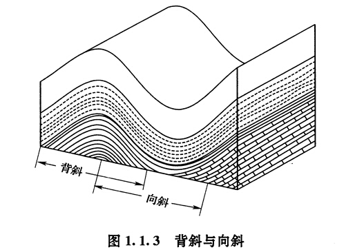褶曲是褶皺構(gòu)造中的一個(gè)彎曲,兩個(gè)或兩個(gè)以上褶曲構(gòu)造的組合構(gòu)成褶皺構(gòu)造,每一個(gè)褶曲都有核部、翼、軸面、軸及樞紐等幾個(gè)褶曲要素。褶曲的基本形態(tài)是背斜和向斜,如圖1.1.3所示。背斜褶曲是巖層向上拱起的彎曲,以褶曲軸為中心向兩翼傾斜。當(dāng)?shù)孛媸艿絼兾g而出露有不同地質(zhì)年代的巖層時(shí),較老的巖層出現(xiàn)在褶曲的軸部,從軸部向兩翼,依次出現(xiàn)的是較新的巖層。向斜褶曲,是巖層向下凹的彎曲,其巖層的傾向與背斜相反,兩翼的巖層都向褶曲的軸部傾斜。當(dāng)?shù)孛嬖馐軇兾g,在褶曲軸部出露的是較新的巖層,向兩翼依次出露的是較老的巖層。