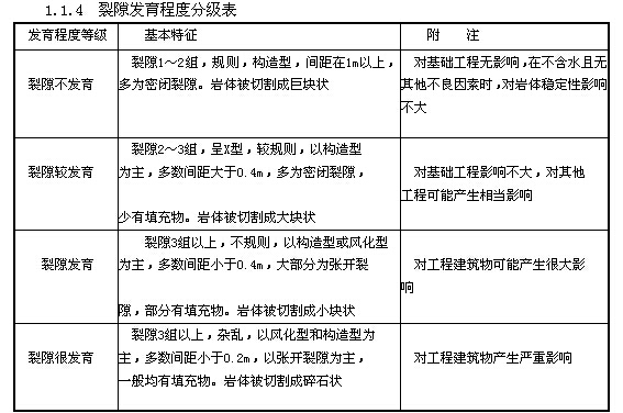 ?、倭严?。裂隙也稱為節(jié)理,是存在于巖體中的裂縫,是巖體受力斷裂后兩側(cè)巖塊沒有顯著位移的小型斷裂構(gòu)造。在數(shù)值上一般用裂隙率表示,即巖石中裂隙的面積與巖石總面積的百分比,裂隙率越大,表示巖石中的裂隙越發(fā)育;反之,則表示裂隙不發(fā)育。在表1.1.4中介紹了公路工程對裂隙發(fā)育程度劃分的等級及對工程的影響。