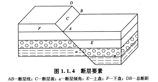 ?、跀鄬?。斷層是巖體受力作用斷裂后,兩側(cè)巖塊沿?cái)嗔衙姘l(fā)生顯著相對位移的斷裂構(gòu)造。斷層一般由四個(gè)部分組成,如圖1.1.4所示。
