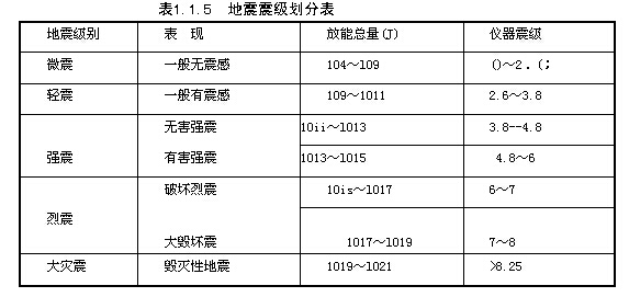 地震是依據(jù)地震釋放出來的能量多少來劃分震級的,釋放出來的能量越多,震級就越大。中國科學(xué)院將地震震級分為五級:微震、輕震、強(qiáng)震、烈震和大災(zāi)震。地震釋放的能量與儀器測定的震級劃分見表1.1.5。