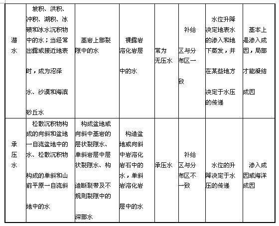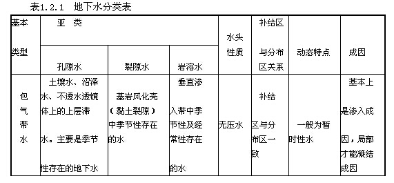 根據埋藏條件,將地下水分為包氣帶水、潛水、承壓水三大類。根據含水層的空隙性質,地下水又分為孔隙水、裂隙水和巖溶水三個亞類。根據上述分類原則,將地下水的基本類型列于表1.2.10