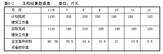 經業主的工程師代表簽認的承包商在第2年各月計劃和實際完成的建安工作量以及業主直接提供的材料、設備價值如表6-2所示。