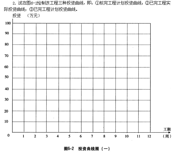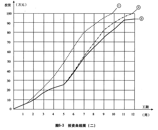 解:根據表中數據繪出投資曲線圖如圖6-3所示,圖中:①擬完工程計劃投資曲線;②已完工程實際投資曲線;③已完工程計劃投資曲線。
