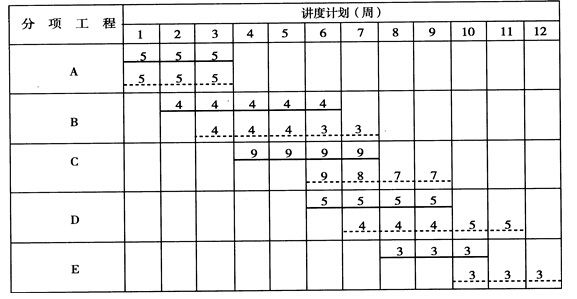 某工程計劃進度與實際進度如表6-17所示。表中粗實線表示計劃進度(進度線上方的數據為每周計劃投資),粗虛線表示實際進度(進度線上方的數據為每周實際投資),假定各分項工程每周計劃進度與實際進度均為勻速進度,而且各分項工程實際完成總工程量與計劃完成總工程量相等。