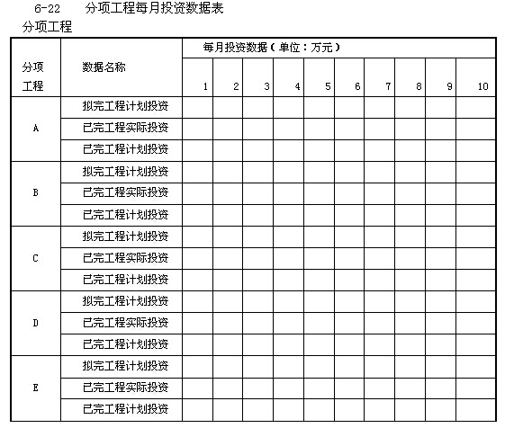 1.假定各分項工程的計劃進度和實際進度都是勻速的,施工期間1 ~10月各月結算價格調價系數依次為:1.00,1.00,1.05,1.05,1.05,1.08,1.10,1.10,1.05、1.050試計算各分項工程的每月擬完工程計劃投資、已完工程實際投資、已完工程計劃投資,并將結果填人表6-22中。