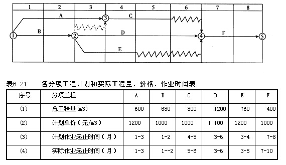 某工程項目包括A、B、C、D、E、F6項分項工程。該工程采用單價合同,工期為8個月。工期每提前1個月獎勵1.5萬元,每拖后1個月罰款2萬元。項目經理部編制的時標網絡進度計劃如表6-20所示,各分項工程的總工程量和計劃單價、計劃作業起止時間見表6-21中(1)、(2)、(3)欄所示。該計劃在開工前已得到甲方代表的批準。