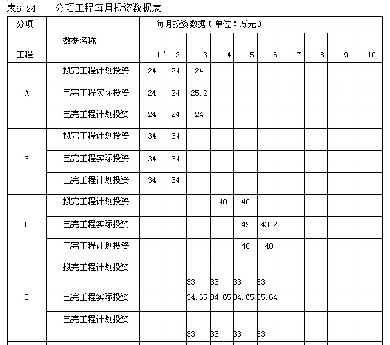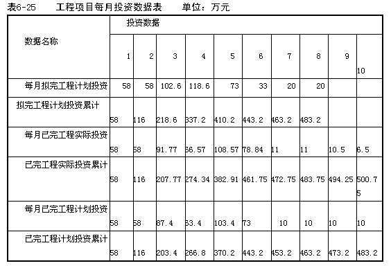解:根據表6-24統計整個工程項目每月投資數據,見表6-25。