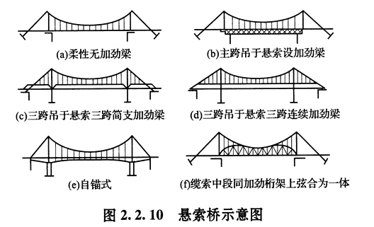 般由橋塔、主纜索、錨碇、吊索、加勁梁及索鞍等主要部分組成,如圖2.2.10所示。