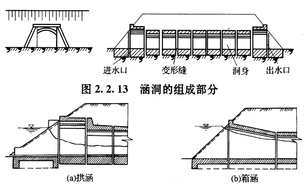 涵洞由洞身、洞口、基礎和附屬工程組成,如圖2.2.13所示。在地面以下,防止沉