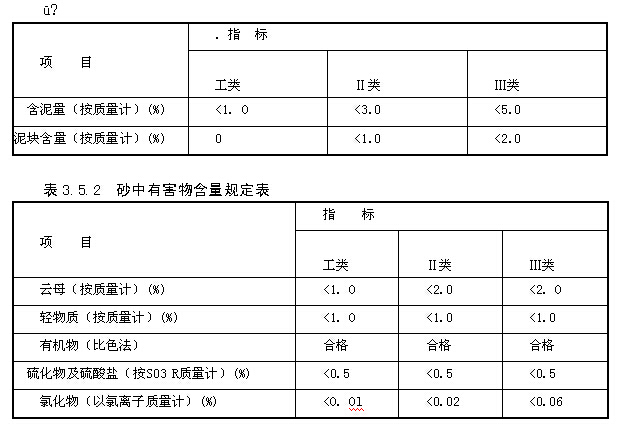 砂中常有黏土、淤泥、有機物、云母、硫化物及硫酸鹽等雜質。黏土、淤泥粘附在砂粒表面,妨礙水泥與砂粒的粘結,降低混凝土強度、抗凍性和抗磨性,并增大混凝土的干縮。砂中含泥量和泥塊含量規定見表3.5.10云母呈薄片狀,表面光滑,與水泥粘結不牢,降低混凝土的強度。有機物、硫化物和硫酸鹽等對水泥均有腐蝕作用,含量規定見表3.5.20 表3.5.1 砂中含泥量和泥塊含量規定表
