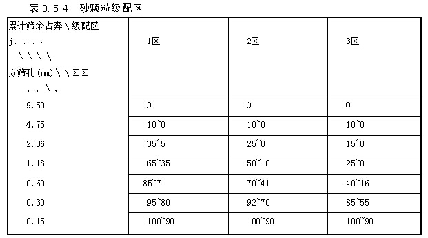 砂的顆粒級配用級配區表示,根據《建筑用砂》GB/T 14684的規定,對細度模數為3.7~1.6的砂,按累計篩余百分率劃分為三個級配區,見表3.5.40混凝土用砂的顆粒級配應處于表3.5.4中的任何一個級配區內,表中所列的累計篩余百分率,除4.75mm和0.60mm篩號外,允許稍有超出分界線,其總量不大于5%。