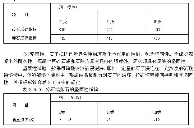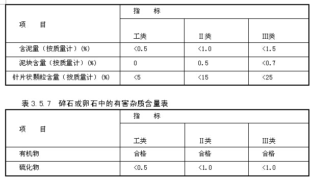 石子中含有黏土、淤泥、有機物、硫化物及硫酸鹽和其他活性氧化硅等雜質。有的雜質影響粘結力,有的能和水泥產生化學作用而破壞混凝土結構。此外,針片狀顆粒的含量也不宜過多。其控制含量見表3.5.6和表3.5.7。
