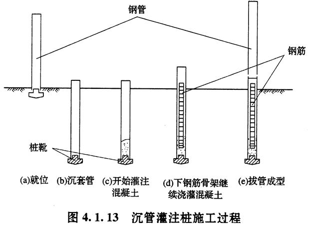 為錘擊灌注樁;利用激振器振動沉管、拔管時,稱為振動灌注樁。見圖4.1.13為沉管灌