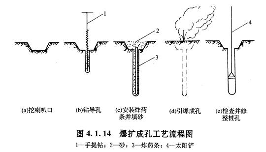 安放炸藥,利用爆炸的力量在底部形成擴大頭(見圖4.1.14);最后灌注混凝土或鋼筋混