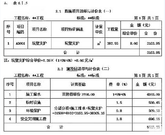 承發包雙方在合同中約定:以人工費、材料費和機械費之和為基數,計取管理費(費率5%)、利潤(利潤率4%);以分部分項工程費合計、施工排水和坑壁支護費之和為基數,計取臨時設施費(費率1.5%)、環境保護費(費率0.8%)、安全和文明施工費(費率1.8%);不計其它項目費:以分部分項工程費合計與措施項目費合計之和為基數計取規費(費率2%)。稅金費率為3.44%。