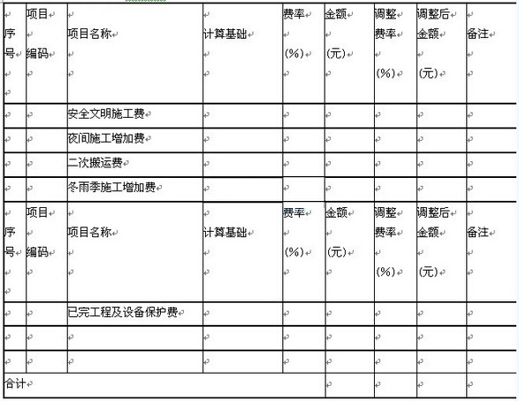 2.按施工方案計算的措施費,若無“計算基礎(chǔ)”和“費率”的數(shù)值,也可只填“金額”數(shù)值,但應(yīng)在備注欄說明施工方案出處或計算方法。