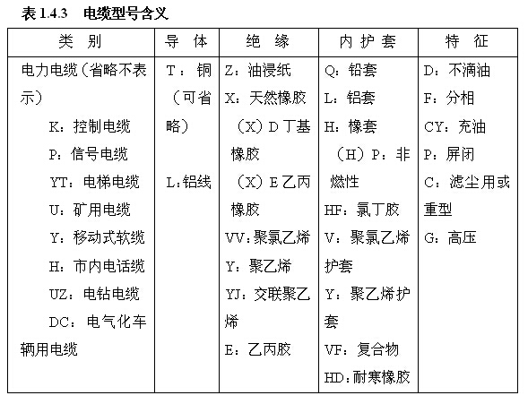 電纜型號的內(nèi)容包含有:用途類別、絕緣材料、導(dǎo)體材料、鎧裝保護(hù)層等,電纜型號含義如表1.4.3所示,一般型號表示如下: