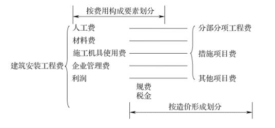按造價形成劃分建筑安裝工程費用項目構成和計算;建筑安裝工程費按照工程造價形成由分部分項工程費、措施項目費、其他項目費、規(guī)費和稅金組成。
