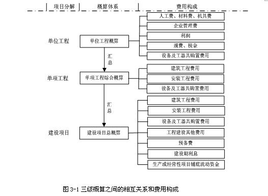 設(shè)計概算可分單位工程概算、單項工程綜合概算和建設(shè)項目總概算三級。各級概算之間的相互關(guān)系如圖3-1所示。