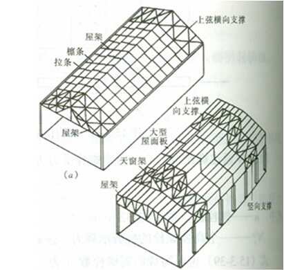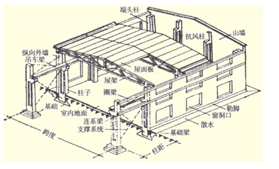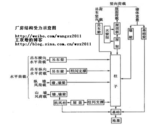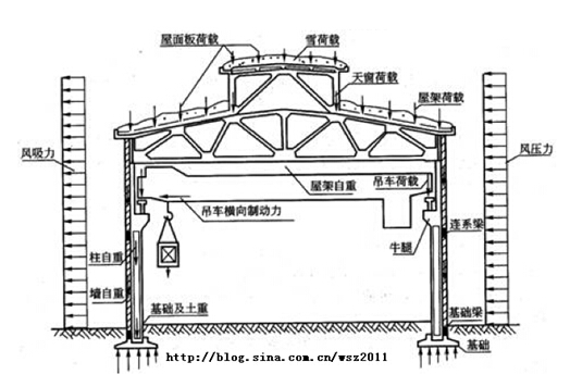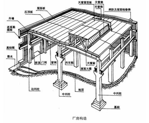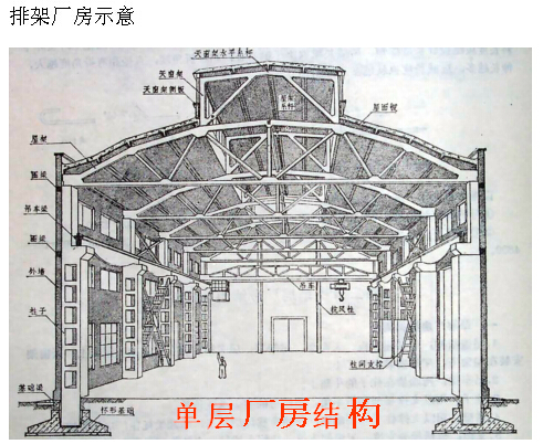 (1)橫向排架:由基礎、柱、屋架組成,主要是承受廠房的各種豎向荷載。