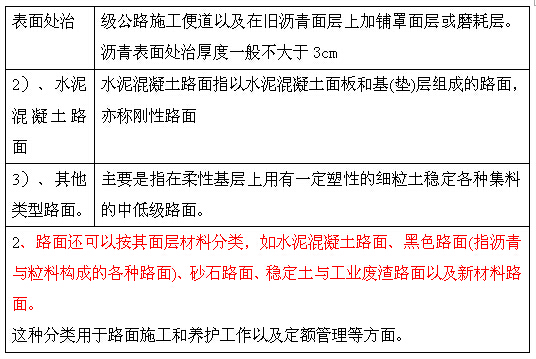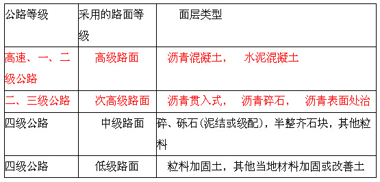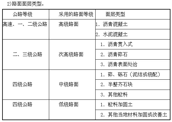 (1)路面等級。路面等級按面層材料的組成、結構強度、路面所能承擔的交通任務和使用的品質劃分為高級路面、次高級路面、中級路面和低級路面等四個等級。