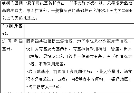 1)圓管涵基礎(chǔ)。 有下列情況之一者,不得采用無基:巖石地基外,洞頂填土高度超過5m;最大流量時,涵前積水深度超過2.5m者;經(jīng)常有水的河溝;沼澤地區(qū);溝底縱坡大于5%。