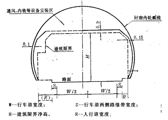 道路建筑限界是為保證車輛和行人正常通行,規定在道路一定寬度和高度范圍內不允許有任何設施及障礙物侵入的空間范圍。地下公路的建筑限界包括車道、路肩、路緣帶、人行道等的寬度以及車道、人行道的凈高。公路隧道的橫斷面凈空,除了包括建筑限界之外,還包括通過管道、照明、防災、監控、運行管理等附屬設備所需的空間,以及富裕量和施工允許誤差等。