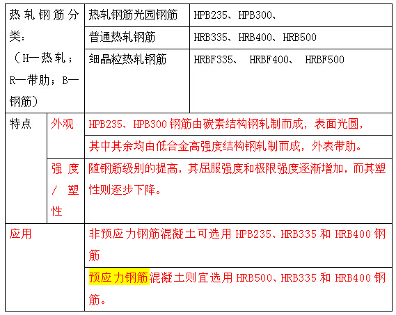 熱軋鋼筋,非預應力鋼筋混凝土可選用HPB235、HRB335和HRB400鋼筋。預應力鋼筋混凝土則宜選用HRB500、HRB335和HRB400鋼筋。