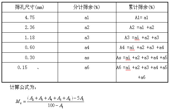 砂的粗細程度和顆粒級配通過篩分析法確定。篩分析法是用一套孔徑為4.75mm、2.36mm、1.18mm、0.60mm、0.30mm和 0.15mm的標準方孔篩的,按照篩孔的大小順序,將用9.50mm方孔篩篩出的500g干砂, 由粗到過篩,稱得各號篩上的篩余量。