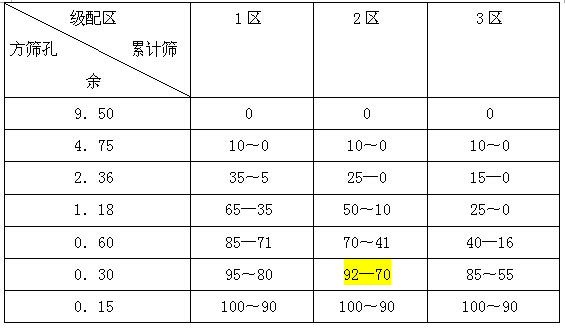 砂的顆粒級配用級配區表示,根據《建筑用砂》GB/T 14684的規定,對細度模數為3.7~1.6的砂,按累計篩余百分率劃分為三個級配區,見表3.5.40混凝土用砂的顆粒級配應處于表3.5.4中的任何一個級配區內,表中所列的累計篩余百分率,除4.75mm和0.60mm篩號外,允許稍有超出分界線,其總量不大于5%。