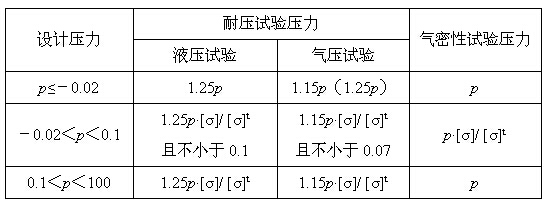 表2.4.1 設備耐壓試驗和氣密性試驗壓力(MPa)
