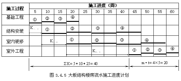 【例3.4.3】某工程項目由四幢大板結構樓房組成,每幢樓房為一個施工段,施工過程劃分為基礎工程、結構安裝、室內裝修和室外工程4項,其流水施工進度計劃如圖3.4.5所示。