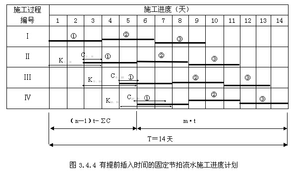 2)有提前插入時間的固定節拍流水施工。所謂提前插入時間,是指相鄰兩個專業工作隊在同一施工段上共同作業的時間。在工作面允許和資源有保證的前提下,專業工作隊提前插入施工,可以縮短流水施工工期。對于有提前插入時間(