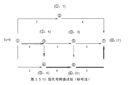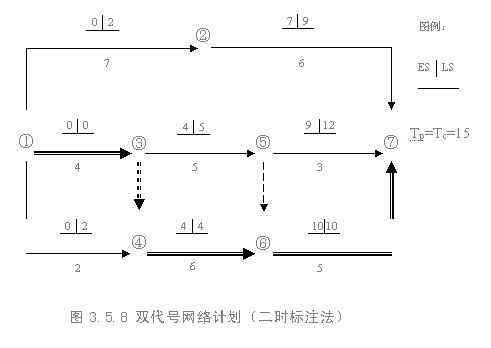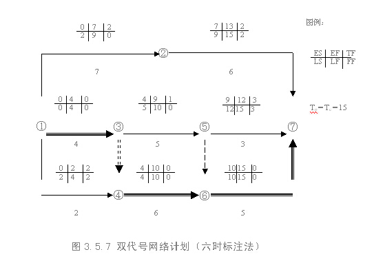 在上述計算過程中,是將每項工作的六個時間參數均標注在圖中,故稱為六時標注法,某工程雙代號網絡計劃如圖3.5.7所示。為使網絡計劃的圖面更加簡潔,在雙代號網絡計劃中,除各項工作的持續時間以外,通常只需標注兩個最基本的時間參數――各項工作的最早開始時間和最遲開始時間即可,而工作的其它四個時間參數(最早完成時間、最遲完成時間、總時差和自由時差)均可根據工作的最早開始時間、最遲開始時間及持續時間導出。這種方法稱為二時標注法,如圖3.5.8所示。