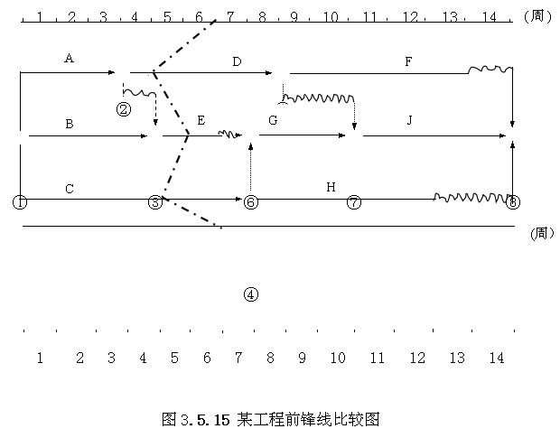【解】根據第6周末實際進度的檢查結果繪制前鋒線,如圖3.5.15中點劃線所示。通過比較可以看出: