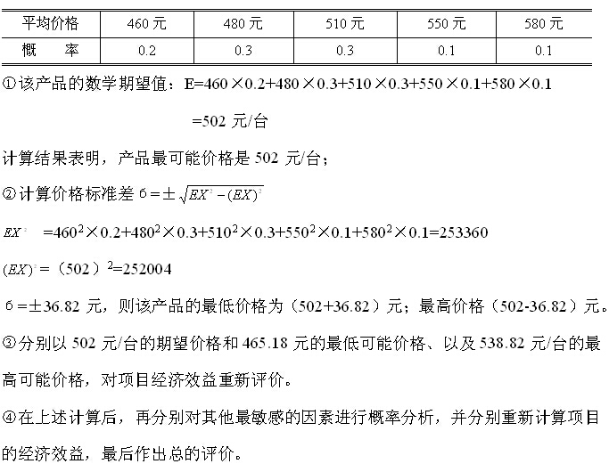 在項目原經濟效益測算中,該產品的加權平均價格為500元/臺,現經老師預測,該產品的平均價格及概率分布見下表,試對該產品作出概率分析,并重新計算項目的經濟效益。