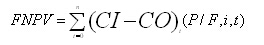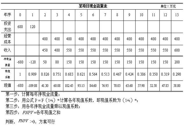 例:某投資項目的各年現金流量見下表,當標準折現率ic=10%時,試用凈現值法判斷該方案是否可行?